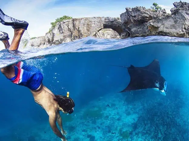 Snorkeling in Nusa Penida offers an unforgettable underwater adventure, featuring vibrant coral reefs, exotic fish species, diverse marine life, and the opportunity to swim alongside majestic manta rays. The tour includes visits to the stunning Kelingking Beach, known for its breathtaking cliff views and iconic T-Rex-shaped rock formation, perfect for a photoshoot! Afterward, relax at Angel’s Billabong & Broken beach